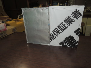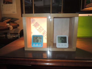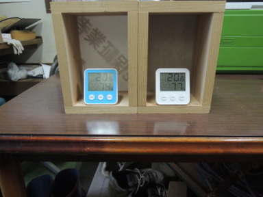 1枚目、同じ材料により作った木の箱、左の箱には通常の防水シートを張り付けまして、右側の箱には遮熱効果のある防水シートを同じ条件のもと張りり付けました。(お家と見立てて)