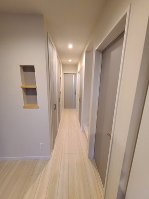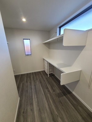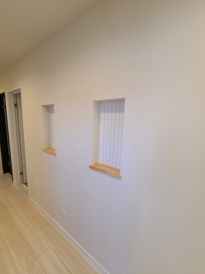 収納に工夫を凝らしたウォークインクローゼットや白を基調とした空間に建具や壁紙でグレーのアクセント!ストライプ柄のニッチで可愛さを演出!素敵な住まいが完成です!詳しい施工紹介をこうご期待!